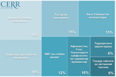 БМТ ва глобал вазиятга оид масалалар 12% улушни, Афғонистон, Ғазо, Украинадаги хавфсизлик ва гуманитар муаммолар 10% ни ташкил қилган.