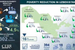The most significant reductions in poverty were observed in Jizzakh region (from 11.8% to 5.8%), Khorezm region (from 11.9% to 6.7%), Syrdarya region (from 11.3% to 6.2%), the Republic of Karakalpakstan (from 10.8% to 6.6%), as well as in the city of Tashkent (from 7.3% to 3.5%).