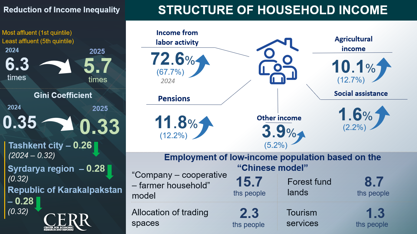 An important factor in creating high-income jobs and reducing poverty was the introduction of new approaches based on international experience, including the “Chinese model” approach (PP-12 of January 17, 2025). The adopted measures aim to expand economic opportunities for vulnerable groups, increase their engagement in entrepreneurial and production activities, and create sustainable income sources at the local level.