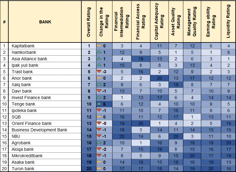 Liquidity. The leaders were Asia Alliance Bank, Ipak Yuli Bank and Trast Bank. At the same time, Mikrokreditbank, Ipoteka Bank, Anor Bank and SQB each declined by 1 position.