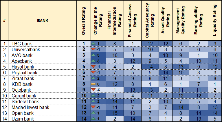 Capital Adequacy. The top positions were occupied by Orient Finance Bank, Trast Bank and Halk Bank. At the same time, Agrobank dropped by 4 positions, while Aloqa Bank declined by 2 positions.