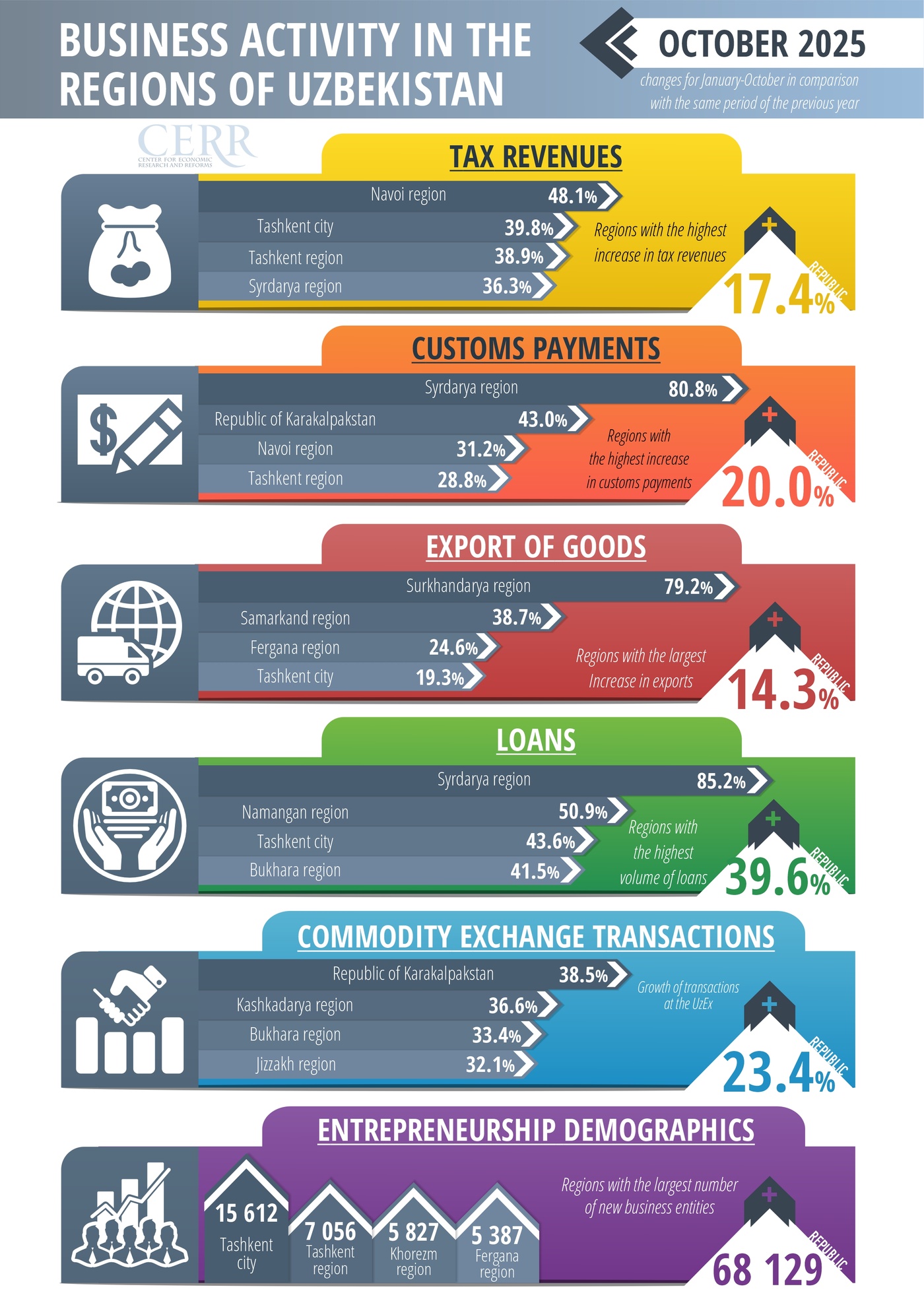 According to preliminary data from the Tax and Customs Committees, the Central Bank, and the Republican Commodity and Raw Materials Exchange, the Center for Economic Research and Reforms is monitoring business activity across the regions of the Republic of Uzbekistan.