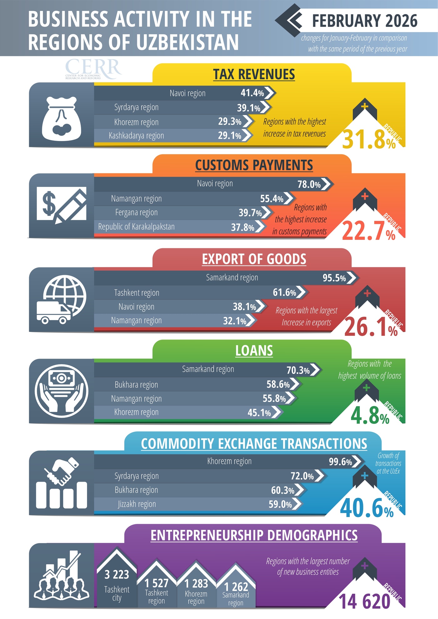 Based on operational data from the Tax Committee, Customs Committee, the Central Bank, and the Uzbek Republican Commodity Exchange, the Center for Economic Research and Reforms (CERR) conducts regular monitoring of regional business activity in the Republic of Uzbekistan.