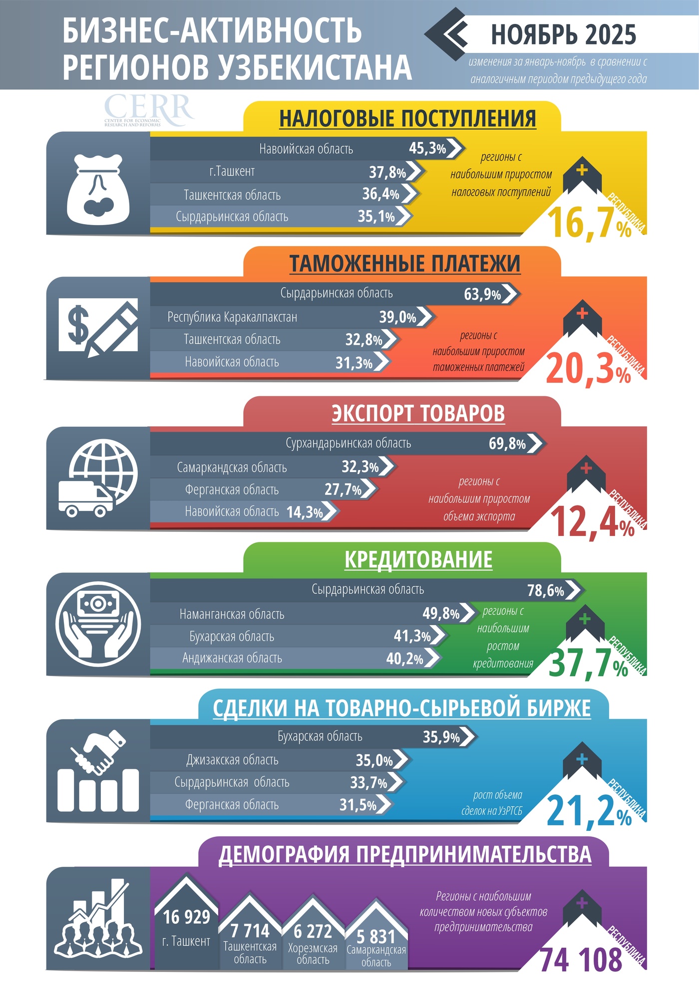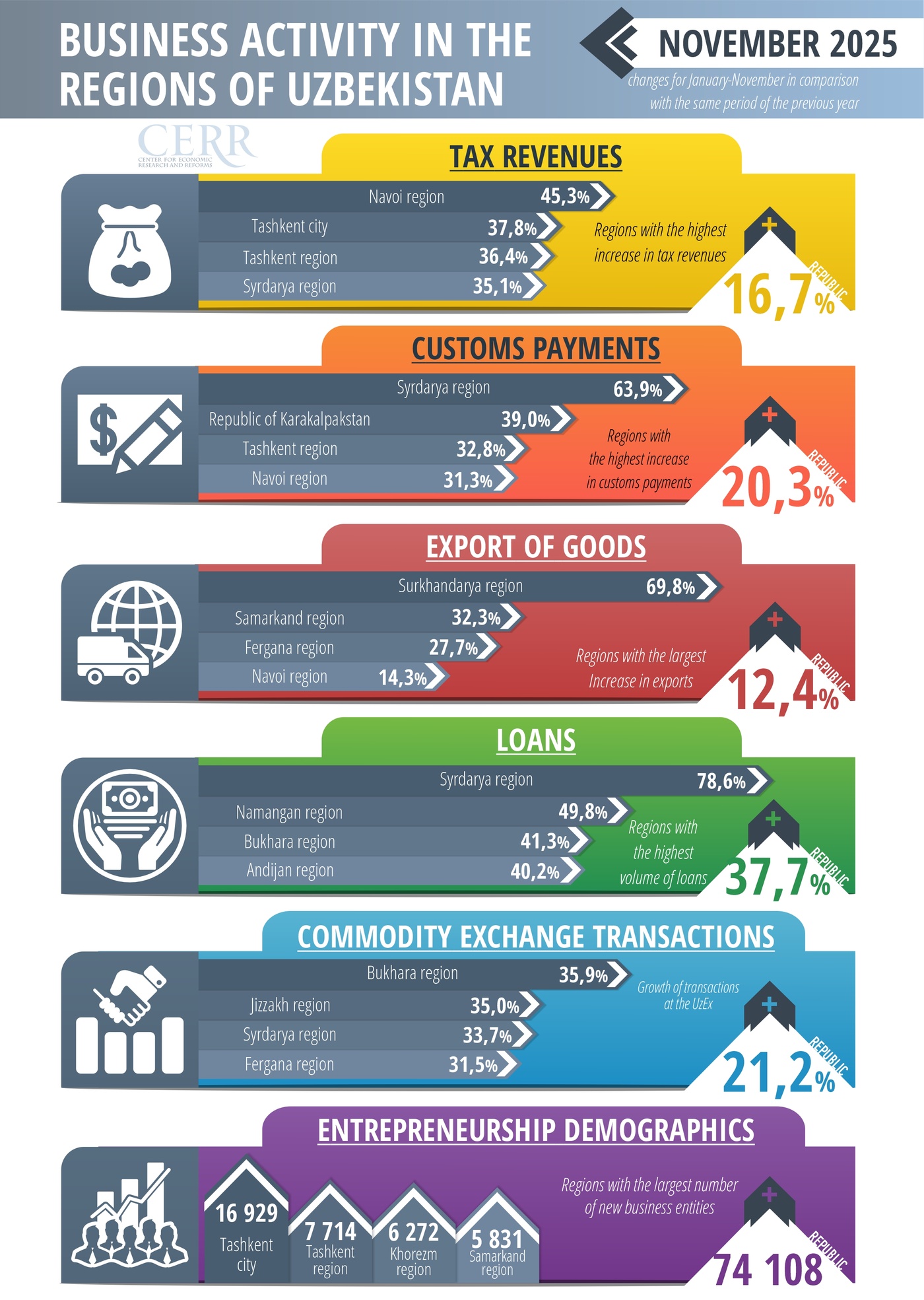 According to the preliminary data of the Tax and Customs Committees, the Central Bank, and the Republican Commodity and Raw Materials Exchange, the Center for Economic Research and Reforms monitors business activity in the regions of the Republic of Uzbekistan.