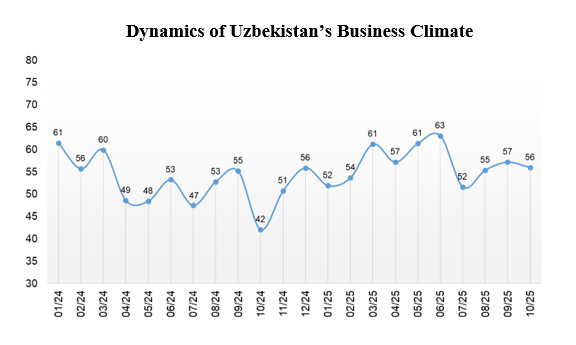 The Uzbekistan Business Climate Index is calculated by the CERR based on surveys of over 1,000 enterprises across various sectors. The index is constructed using the methodology of Germany’s IFO Institute. During the surveys, business leaders assess current and expected changes in the business environment, based on production dynamics, demand, and other factors.