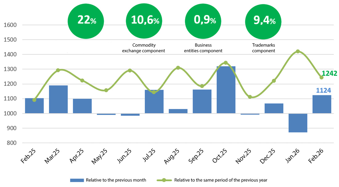 The Business Activity Index (BAI), estimated by the Center for Economic Research and Reforms, reached 1124 points in February 2026, increasing by 12.4% compared with the previous month (and by 24.2% compared with the same period last year, Chart No.1).