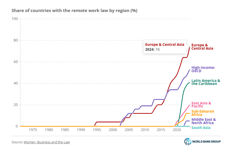 In the Europe and Central Asia region, 17 out of 23 economies have laws regulating remote work. Among these, 11 also provide flexible time arrangements, representing 47 % of the economies in the region.