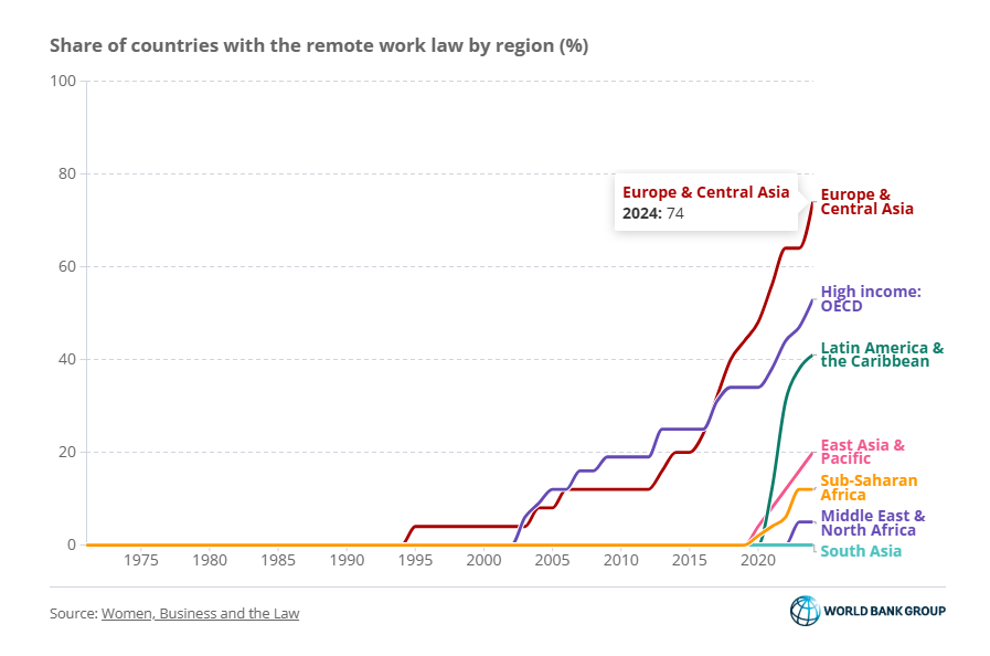 Women, Business and the Law has collected historical legal data on flexible work in 190 economies, from 1971 to 2024. The data show which countries were early adopters, and which ones have only recently begun to legislate flexibility. It also helps to identify regional trends and the global legal shift since the pandemic hit.