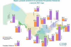 In August 2021, the Business Activity Index for 13 regions increased compared to the previous month (July 2021), except for the Tashkent region. Significant growth was observed in Fergana (55.5%), Samarkand (42.4%), Khorezm (38.1%), Namangan (38.0%) and Jizzakh (34.8%) regions (Fig. 2).
