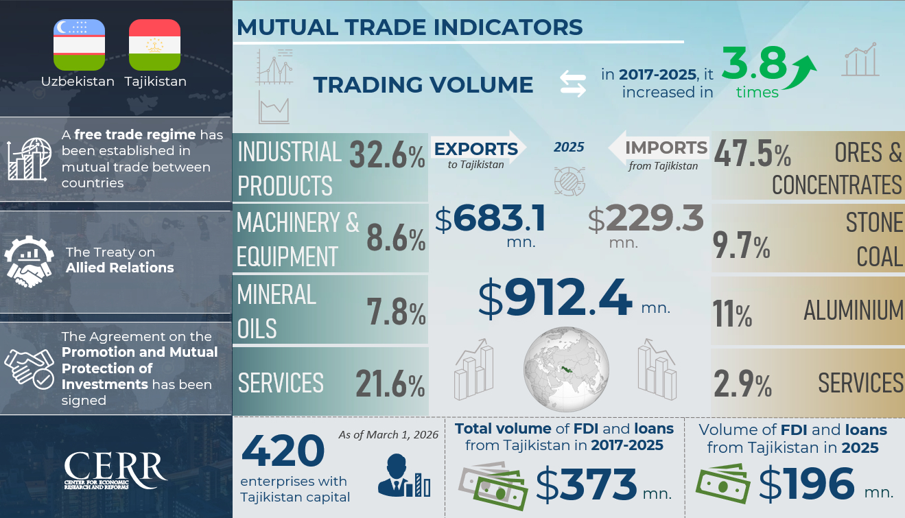 The Center for Economic Research and Reforms (CERR) has prepared an infographic presenting key indicators of trade, economic and investment cooperation between Uzbekistan and Tajikistan over a nine-year period.