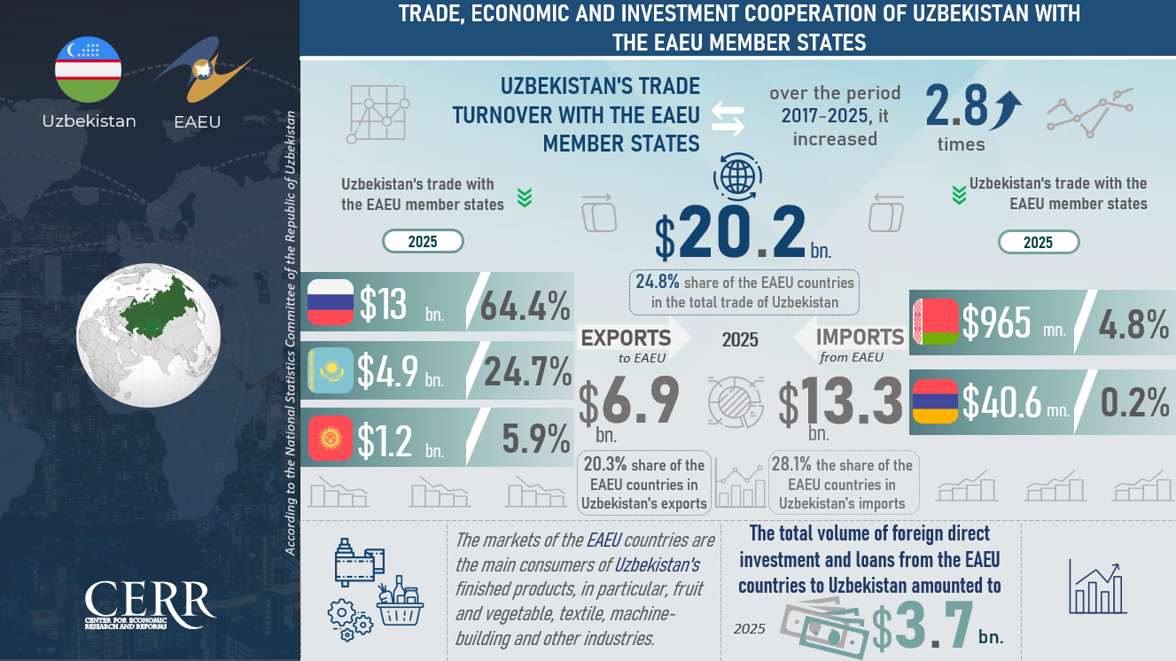 As of the end of 2025, EAEU countries accounted for 24.8% of Uzbekistan’s total foreign trade turnover, 20.3% of exports, and 28.1% of imports.