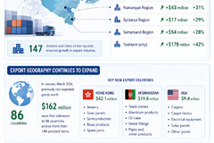 Regional export activity also expanded. In Andijan region, exports increased by $83 mn, or 74%; in Khorezm region by $27 mn, or 66%; in Navoi region by $15 mn, or 42%; in Fergana region by $54 mn, or 42%; in Namangan region by $43 mn, or 31%; in Syrdarya region by $17 mn, or 29%; and in Samarkand region by $54 mn, or 28%. In Tashkent city, exports grew by $178 mn, or 42%.