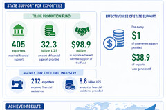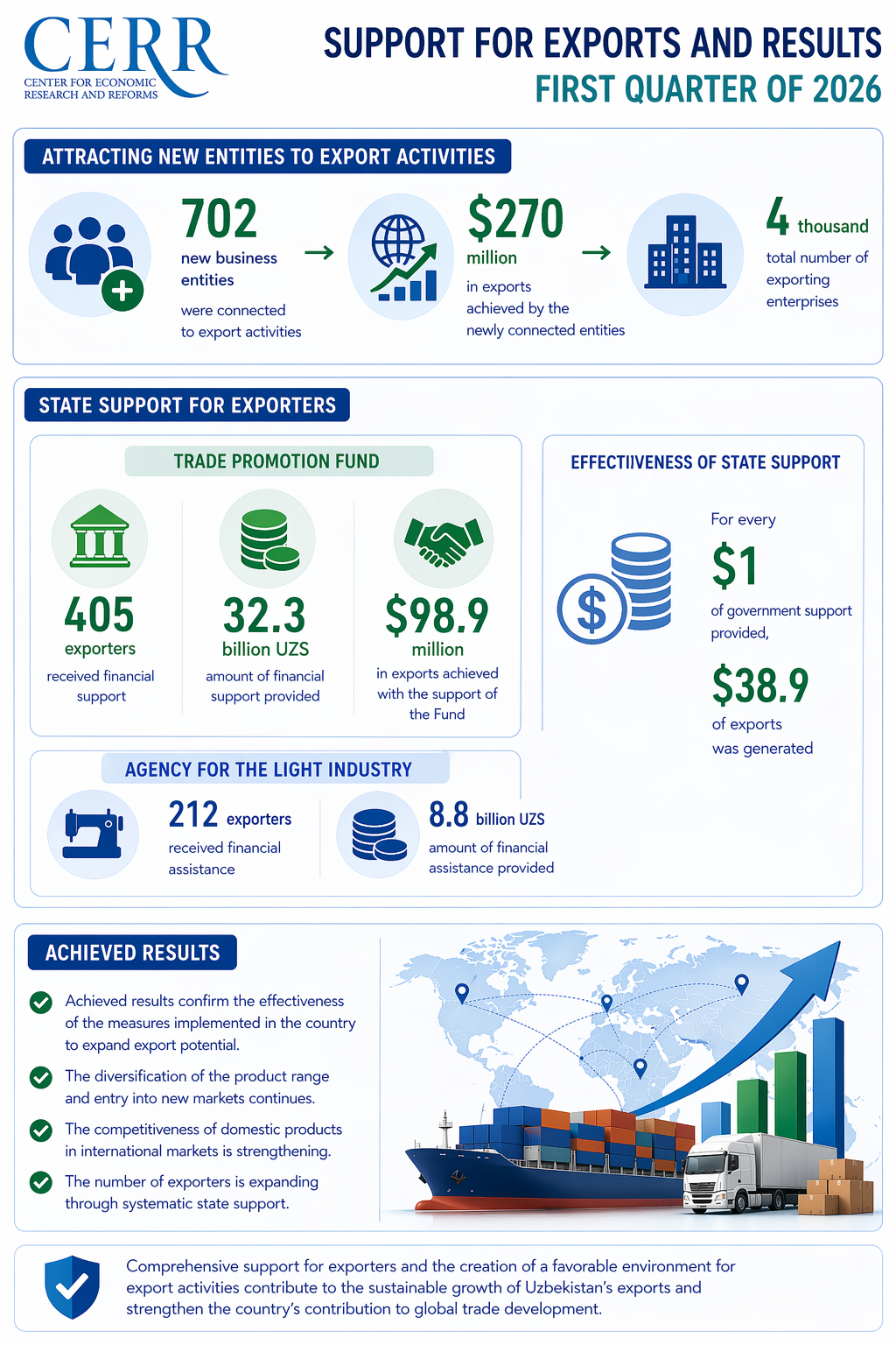 Within the national export support system, financial and organizational assistance to exporting enterprises continued. Through the Trade Promotion Fund, 405 exporters received financial support totaling 32.3 bn soums, while these companies exported goods worth $98.9 mn. Every $1 of state support generated $38.9 in exports.