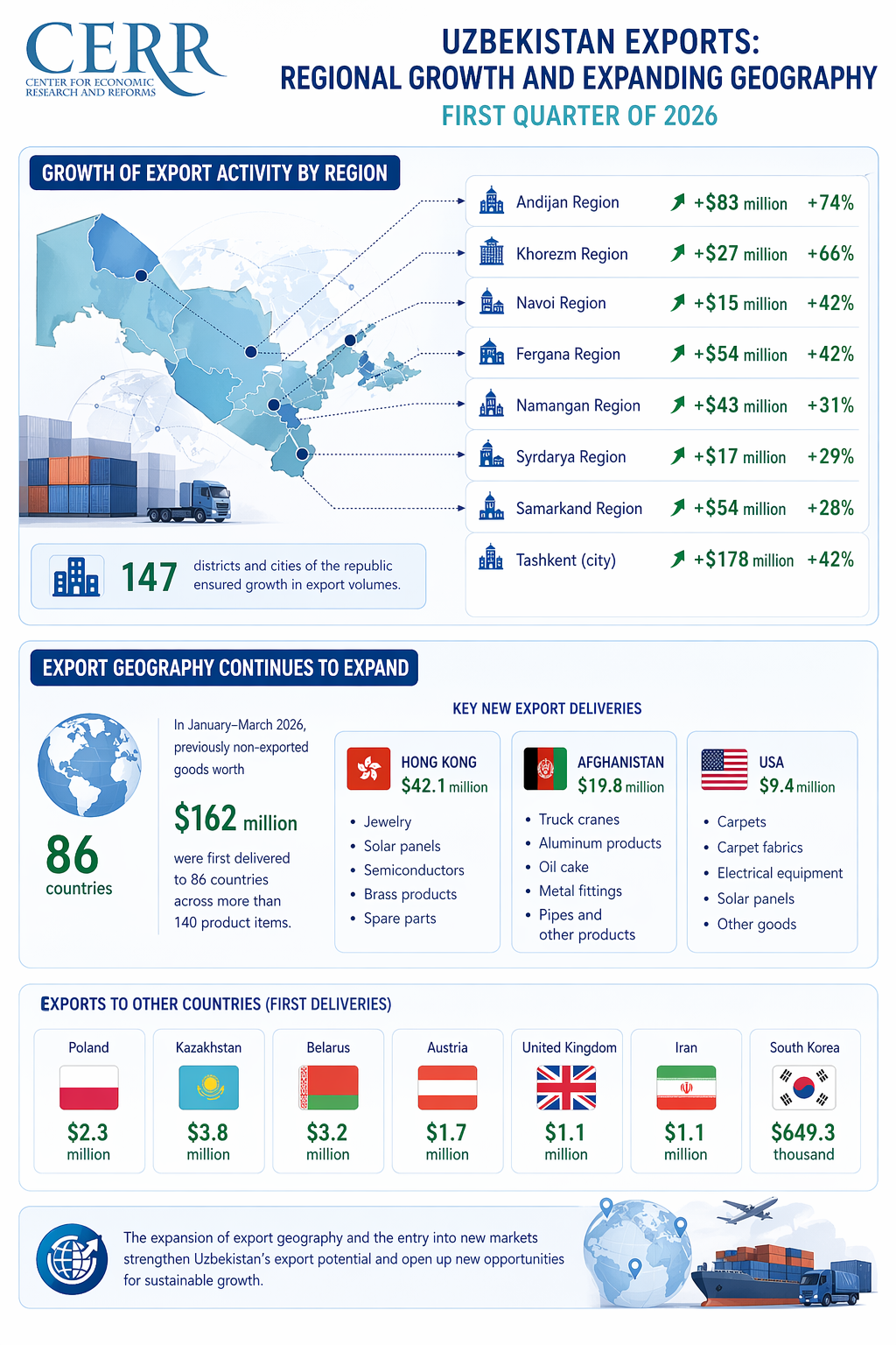 The geography of exports continues to expand. In January–March of the current year, previously non-exported goods worth $162 mn across more than 140 product categories were supplied for the first time to 86 countries, including the United States, Austria, Belarus, Poland, South Korea, Iran, Kazakhstan, and Afghanistan.