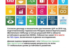 For reference: To assess the achievement of the SDGs, a special Sustainable Development Goals Index (SDG Index) was created. The government monitors the effectiveness of reforms through 23 global ratings (indices), including the global SDG rating, according to which Uzbekistan today ranks 52nd among 162 countries. Thus, according to the rule of law index compiled by the international organization World Justice Project, in 2020 Uzbekistan took 92nd place among 128 countries, having risen four positions over the year.