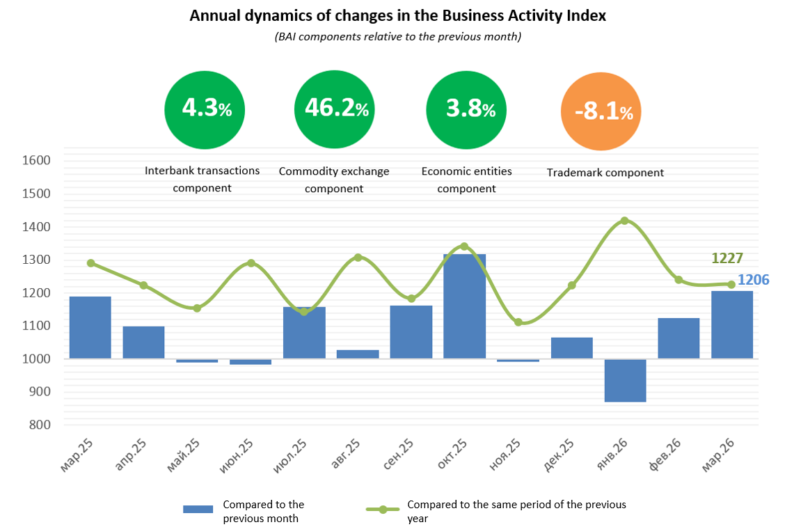 The Business Activity Index (BAI) stood at 1206 points in March 2026, rising by 20.6% compared to the previous month and by 22.7% year-on-year.