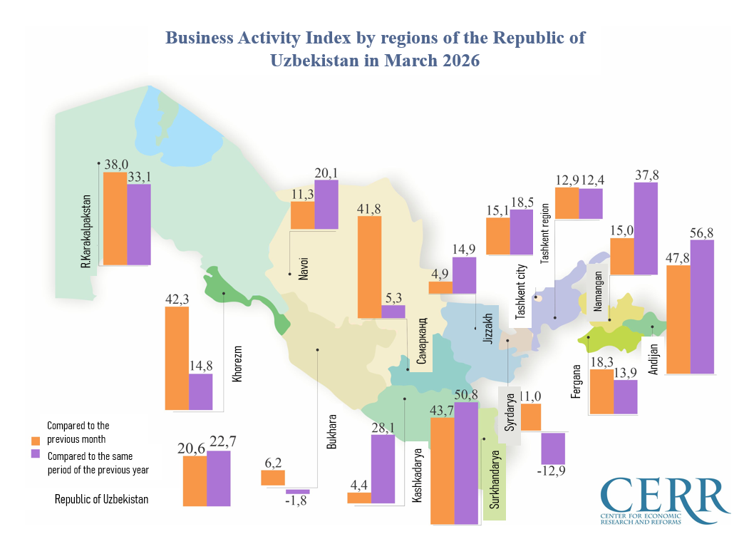 In addition, growth in the BAI compared to the previous month was recorded across all regions of the country. The most notable increases were observed in Andijan region (47.8%), Surkhandarya (43.7%), Khorezm (42.3%), and Samarkand (41.8%).