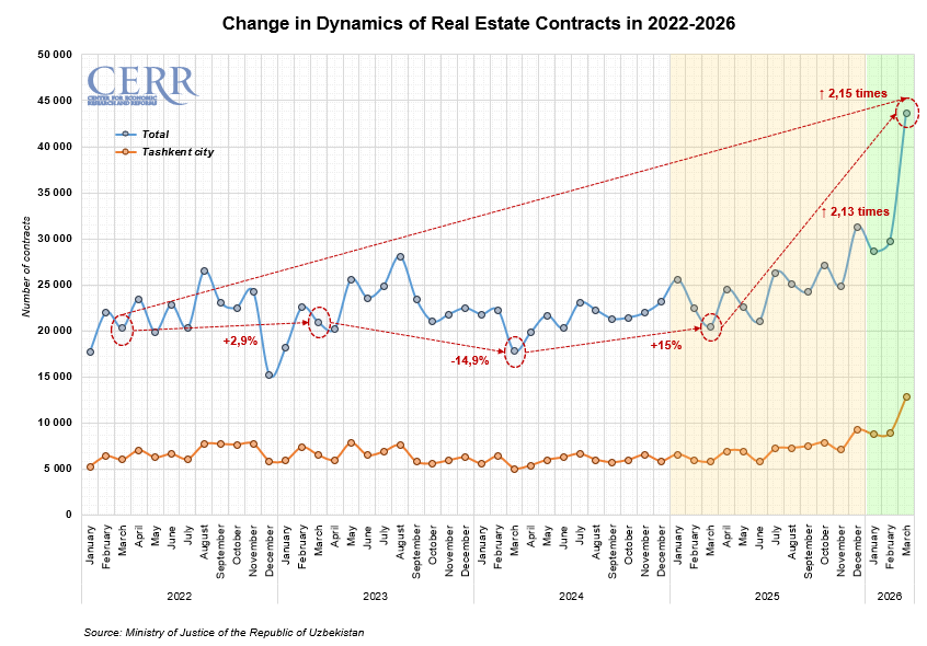 The Center for Economic Research and Reforms has presented its updated review of Uzbekistan’s real estate market based on the results of March 2026. The market demonstrated sharp growth and an acceleration in activity.