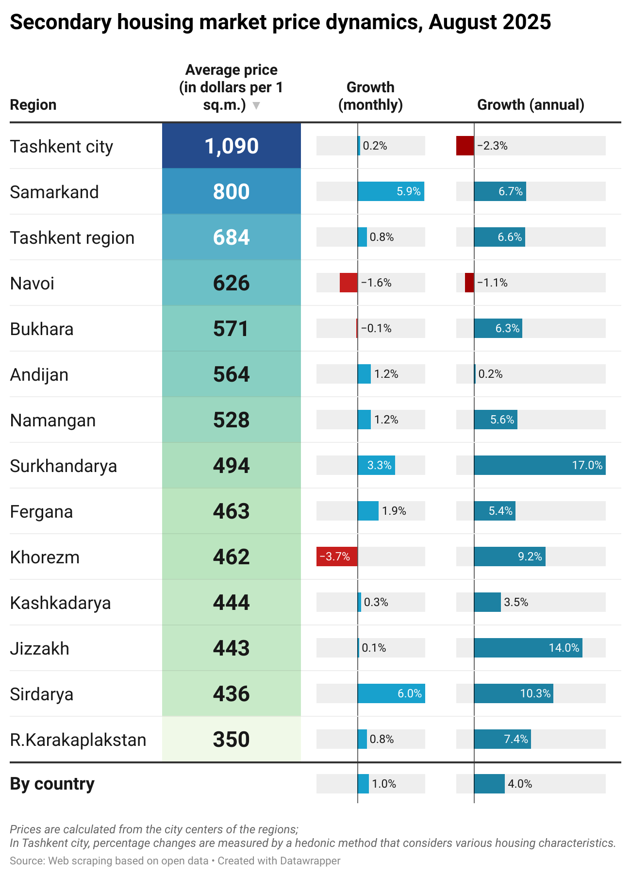 Uzbekistan’s secondary housing market showed moderate price dynamics. Following a 1.7% increase in July, the average market price per square meter rose by 1% in August. On an annual basis, secondary housing prices increased by 4%.