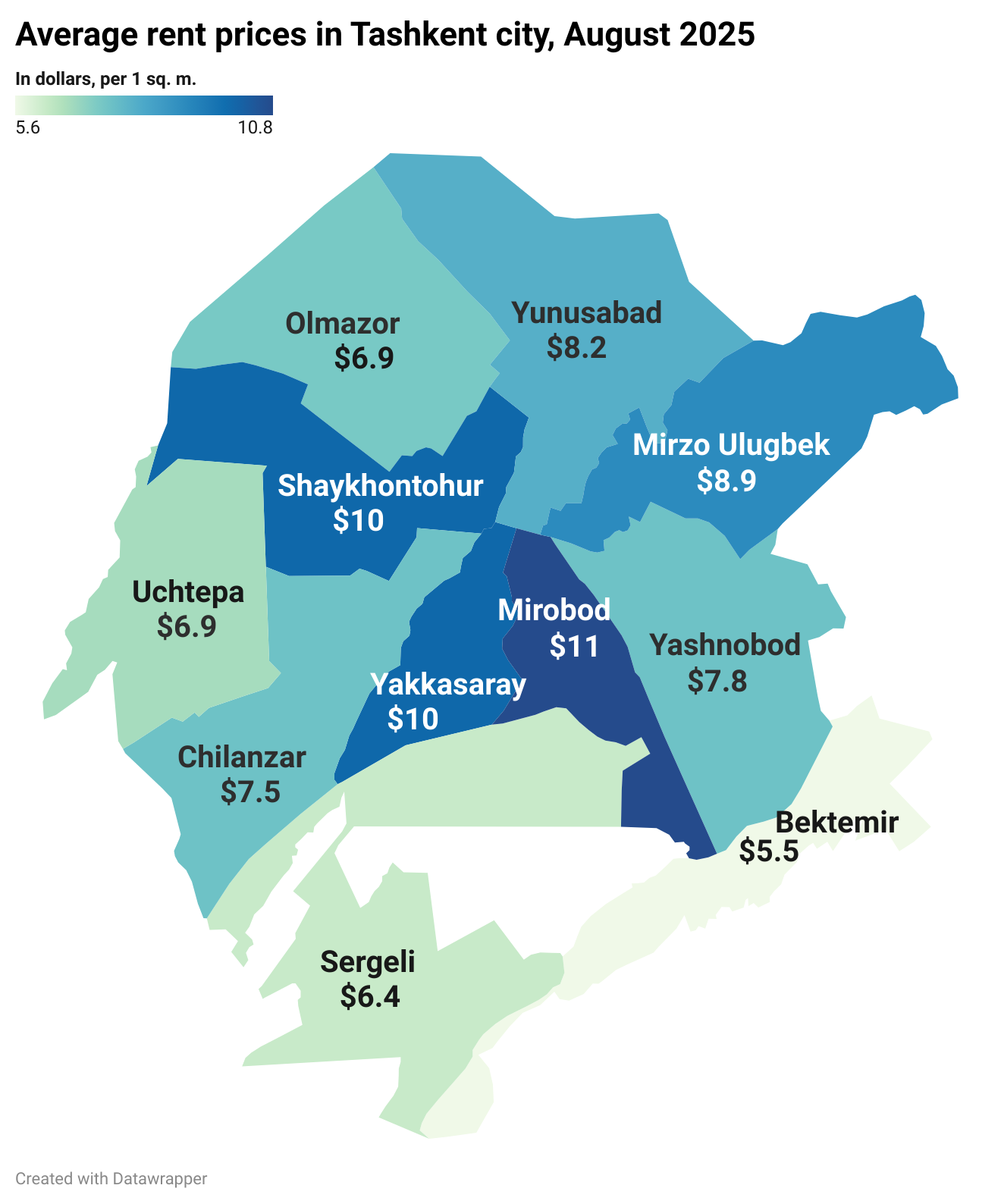 In August, the rental market in Tashkent remained stable, with the average rate unchanged from previous months at $8 per square meter. The highest rental prices persist in the central districts of the capital — Mirabad, Shaykhantakhur, and Yakkasaray — where the average is around $10.3 per square meter.