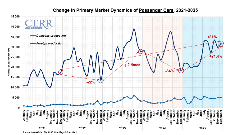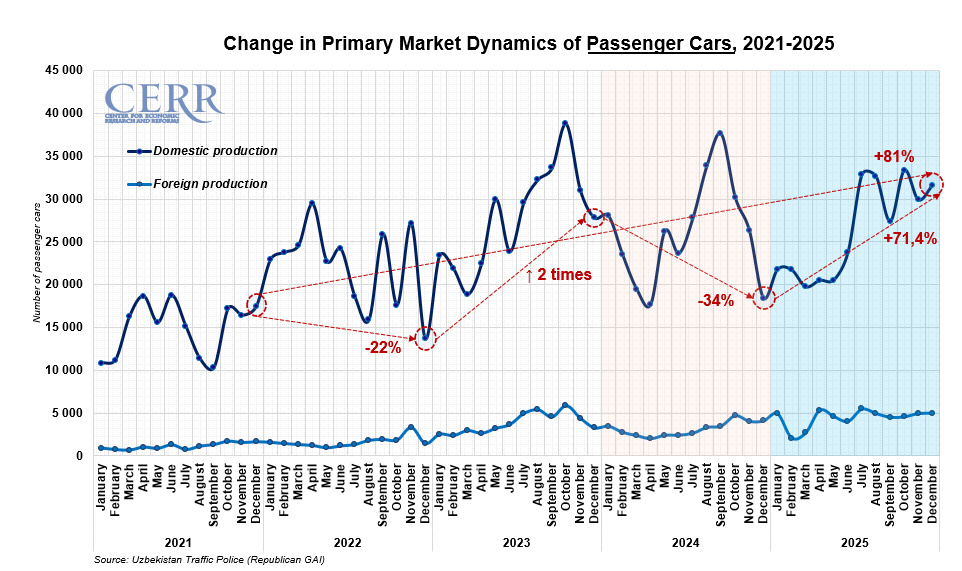 At the same time, over the year, sales volumes of new passenger cars declined in the city of Tashkent, as well as in Navoi Region and Khorezm Region.