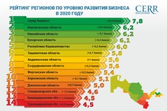 According to the assessment results, the highest level of business development was recorded in Tashkent (7.8 points). The lowest rates were recorded in Kashkadarya (4.5 points), Surkhandarya (4.5 points) and Samarkand (4.6 points) regions.