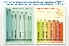The leaders were Bektemir (9.0 points), Muynak (8.9 points), Kurgantepa, Yakkasaray and Karmana (8.4 points) districts. Moreover Bakhmal (6.3 points), Buvayda (6.4 points), Toprak-kala, Uchkuprik, Samarkand, Bekabad and Yangiyul districts (6.5 points) took the last places in the ranking.