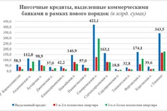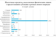 Наибольшая доля ипотечных кредитов приходится на Самаркандскую область (422,1 млрд. сумов), город Ташкент (153,7 млрд. сумов), Ферганскую (78,9 млрд. сумов) и Сурхандарьинскую области (77,4 млрд. сумов).