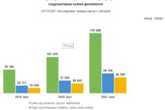 Жорий йилнинг январь-август ойларида банк кассаларидан (шу жумладан, банкоматлардан) берилган нақд пуллар 2020 йилнинг мос даврига нисбатан 50,8 трлн. сўмга ошиши кузатилган бўлса, ушбу ўсишнинг асосий қисми банк карталаридан нақд пул ечиш ҳажми 21,4 трлн. сўмга ҳамда банклар томонидан аҳолидан нақд чет эл валютасини сотиб олиш учун 16,6 трлн. сўм ошиши ҳисобига юзага келди.