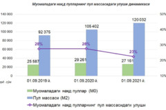 Натижада 2021 йил 1 сентябрь ҳолатига муомаладаги нақд пулларнинг умумий пул массасидаги улуши 23 фоизни ташкил қилиб, ўтган йилнинг мос даврига нисбатан 5 фоиз бандга пасайди.