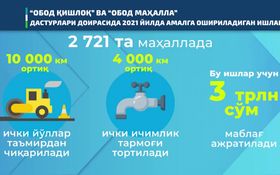 Бу йил 183 та янги уй-жой массивлари қурилмоқда. Уларга 185 километр ичимлик суви, 290 километр оқава тизими, 130 километр электр, 110 километр табиий газ тармоқлари тортилади. Бунинг учун зарур 415 миллиард сўм маблағнинг манбалари аниқ.