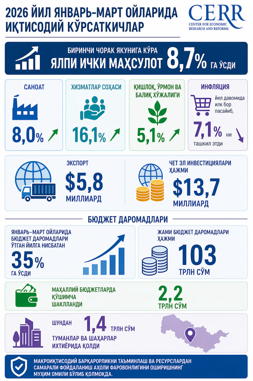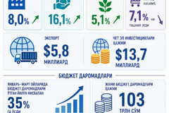 Биринчи чорак якуни билан ялпи ички маҳсулотимиз 8,7 фоизга, саноат 8 фоизга, хизматлар 16,1 фоизга, қишлоқ хўжалиги 5,1 фоизга ўсди. Экспорт 5,8 миллиард долларни, хорижий инвестиция ҳажми эса 13,7 миллиард долларни ташкил қилди. Инфляция йиллик ҳисобда биринчи марта 7,1 фоизгача пасайди.