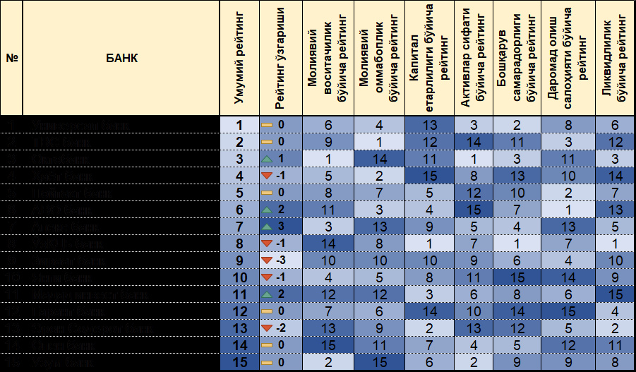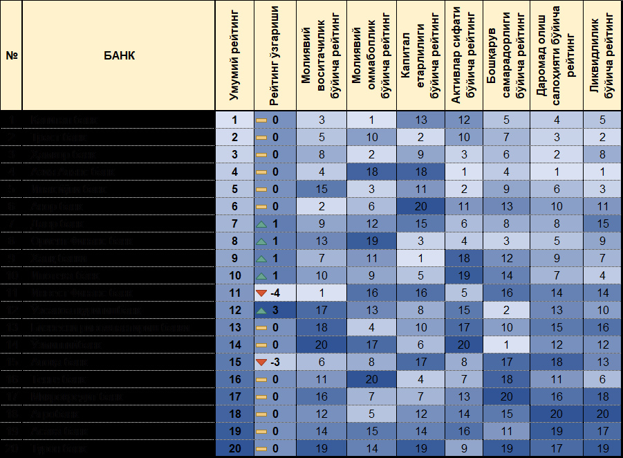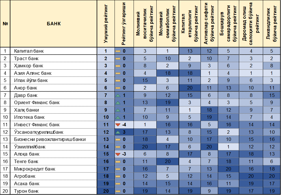 Умуман олганда, 13 та банк умумий фаоллик рейтингида ўз позицияларини сақлаб қолган бўлиб, рақобат кучайиб бораётган шароитда мазкур ҳолат банкларнинг операцион самарадорликни, ликвидликнинг етарли даражасини, активлар сифатини ва барқарорликни таъминлаш салоҳиятини акс эттиради.