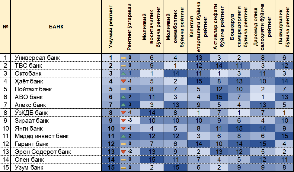 Шунингдек, АВО банк ва Мадад инвест банк ҳар бири иккитадан позицияга кўтарилди, Октобанк эса бир поғонага кўтарилиб, гуруҳ бўйича умумий рейтингда 3-ўринни эгаллади.