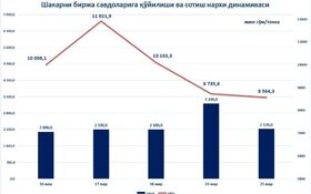 Шу билан бирга, биржа бозорининг айрим товар сегментиларида ўсиш ҳолатлари ҳам кузатилди. Мисол учун, жорий йилнинг 1-17 март кунлари давомида шакарнинг биржадаги нархи маҳсулотнинг бир тоннаси учун 11 921,9 минг сўмгача кўтарилди. Бироқ кейинги кунларда биржа савдоларига қўйилаётган шакар ҳажмининг сотувчи корхоналар томонидан сезиларли даражада оширилиши эвазига шакар нархи маҳсулотнинг бир тоннаси учун 8 981,6 минг сўмгача, яъни 25% га пасайган.