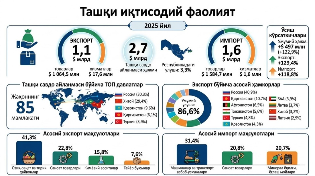 2025 йил январь–декабрь ойларида ташқи савдо айланмаси 2,7 млрд долларни ташкил этди. Жумладан: