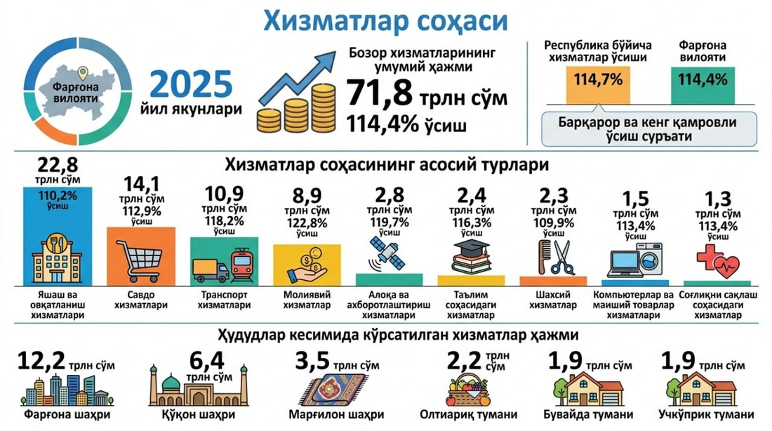 2025 йил якунларига кўра, хизматлар соҳасида барқарор ва кенг қамровли ўсиш кузатилди. Бозор хизматлари ҳажми 114,4%га ўсиб, 71,8 трлн сўмга етди (республика бўйича – 114,7%).