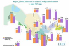 2021 йил июнь ойида Ишбилармонлик фаоллиги индекси 12 та ҳудудда ўтган ойга (2021 йил май) нисбатан ўсиш кузатилган. Тошкент шаҳрида (42,7%), Сурхондарё (48,0%), Бухоро (28,6%), Қашқадарё (21,4%) вилоятлари ва Қорақалпоғистон Республикасида (39,1%)сезиларли даражада ўсиш кузатилган (2-расм).