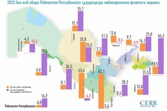 2023 йил май ойида Ишбилармонлик фаоллиги индекси барча 14 та ҳудудда ўтган ойга (апрель) нисбатан ўсиш кузатилган. Сурхондарё (62,1%), Қашқадарё (45,4%), Самарқанд (35,8%), Наманган (14,1%), Андижон (13,5%) вилоятлари ҳамда Тошкент шаҳрида (12,6%) сезиларли даражада ўсиш кузатилган (2 - расм).