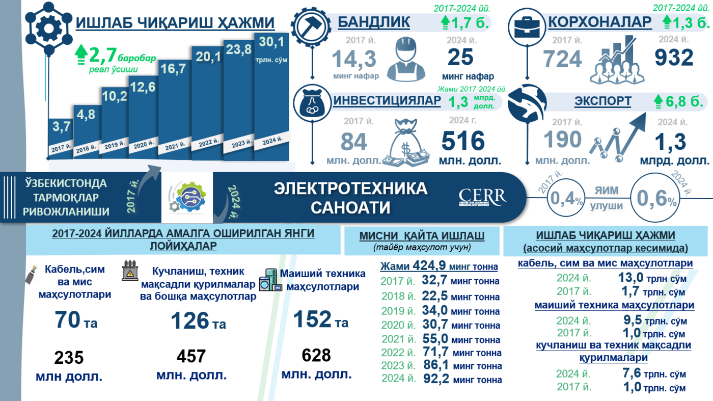 Инфографика: 2017–2024 йилларда Ўзбекистонда электротехника саноати ривожланиши (+видео)