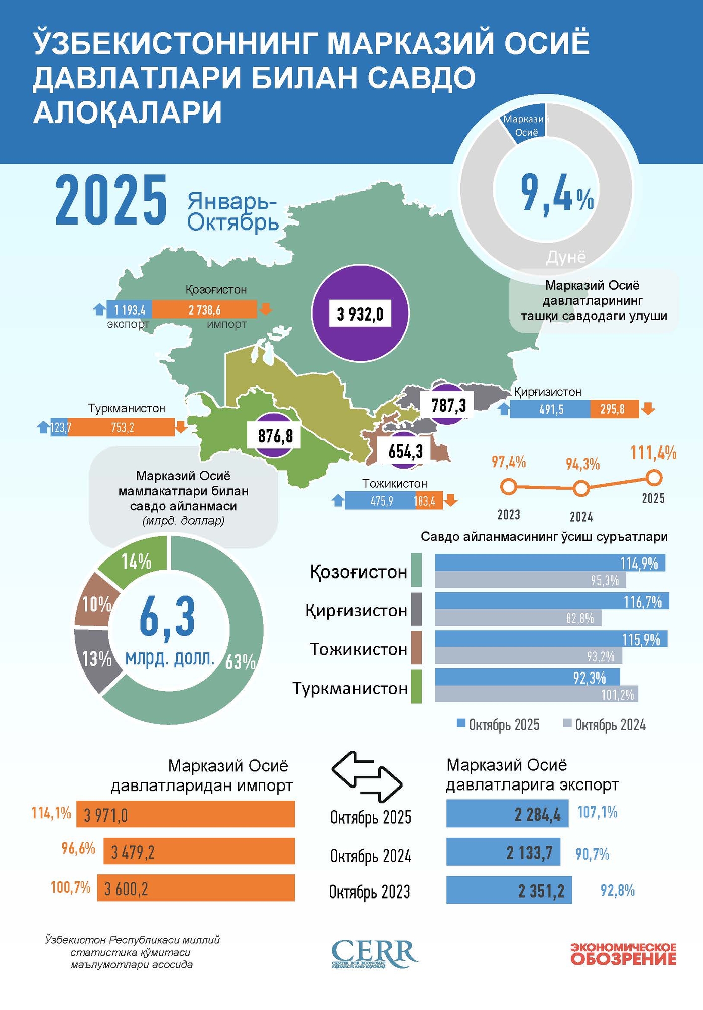 Инфографика: Ўзбекистоннинг Марказий Осиё давлатлари билан 2025 йил октябрь ойидаги савдо алоқаси