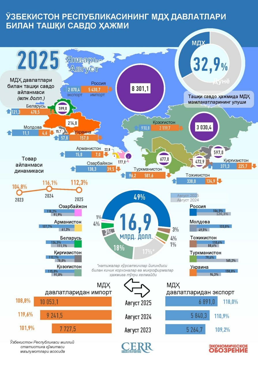 2025 йилнинг август ойида Ўзбекистон Республикаси ташқи савдо айланмасининг 32,9% Мустақил давлатлар ҳамдўстлиги (МДҲ) мамлакатлари ҳиссасига тўғри келди. Шу билан бирга, 2025 йилнинг август ойи якунлари бўйича МДҲ мамлакатларининг умумий ташқи савдо айланмасидаги улуши 2024 йилнинг август ойига нисбатан 2,3%га камайди, ўз навбатида, бошқа хорижий мамлакатлар улуши эса 2,3%га ўсиб, 67,1%ни ташкил этди. Ўзбекистон Республикасининг МДҲ мамлакатлари билан ташқи савдо... ...
