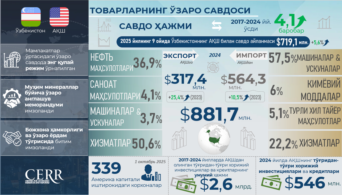 Иқтисодий тадқиқотлар ва ислоҳотлар маркази (Марказ) 2024 йил ҳамда жорий йилнинг 9 ойи давомида Ўзбекистон ва АҚШ ўртасидаги савдо-иқтисодий ҳамда инвестициявий ҳамкорлик кўрсаткичларига оид инфографикани тайёрлади.