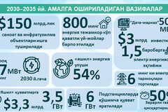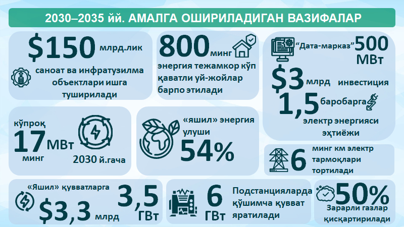 Биринчи навбатда, 2030 йилгача ошиб бораётган эҳтиёжни қоплаш учун 17 минг мегаваттдан ортиқ қайта тикланадиган энергия қувватлари ишга туширилади. Бу «яшил» энергия улушини умумий генерацияда 54 фоизга етказиш ва мамлакат энергетика балансининг тузилмасини сифат жиҳатдан ўзгартириш имконини беради. Ҳозирнинг ўзида Қорақалпоғистон, Бухоро, Қашқадарё ва Тошкент вилоятларида умумий қиймати 3,3 миллиард доллар ва қуввати 3,5 минг мегаватт бўлган лойиҳалар амалга оширилмоқда.