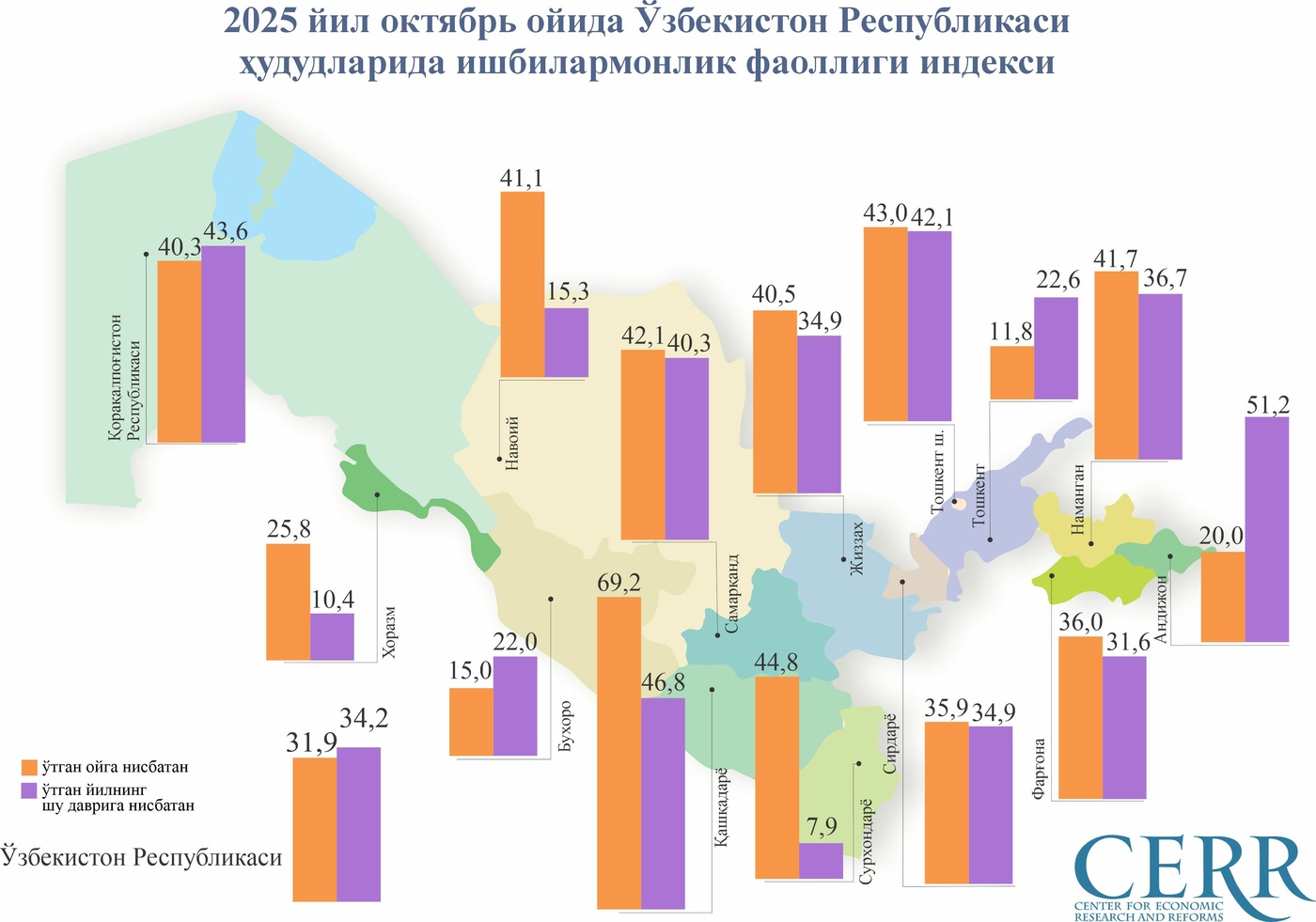 2025 йил октябрь ойида Ишбилармонлик фаоллиги индекси барча ҳудудда ўтган ойга нисбатан ўсиши кузатилган. Жумладан, Қашқадарё (69,2 %), Сурхондарё (44,8 %), Тошкент шаҳри (43,0 %) ва Самарқанд вилоятида (42,1 %) сезиларли даражада ўсиш кузатилган (график №2).