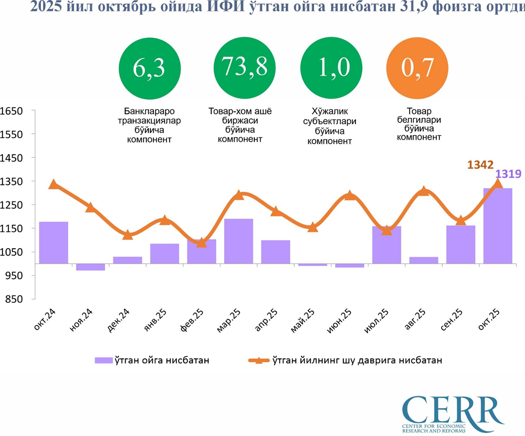 2025 йилнинг октябрь ойида ИФИнинг биржа компоненти 1,7384 бирликни ташкил этди. Бу эса, ушбу компонентнинг ўтган ойга нисбатан 73,8 фоизга ортганини англатиб, ҳар бир битим бўйича сотиб олинган товарларнинг ўртача ҳажми 91,1 фоизга ва тузилган битимлар сони 56,6 фоизга ортганлиги билан изоҳланади.