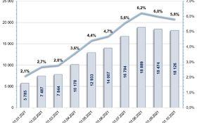 2021 йил 1 октябрь ҳолатига ипотека кредитлари қолдиғининг жами кредит қолдиғига нисбатан улуши 10,5 фоизни (32,8 трлн. сўм) ташкил этиб, ўтган йилнинг мос даврига нисбатан 26,1 фоизга (6,8 трлн. сўмга) ошган. (2-расм).