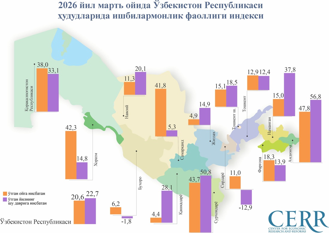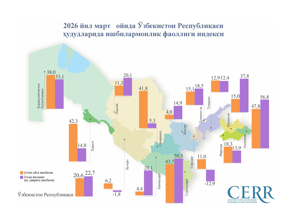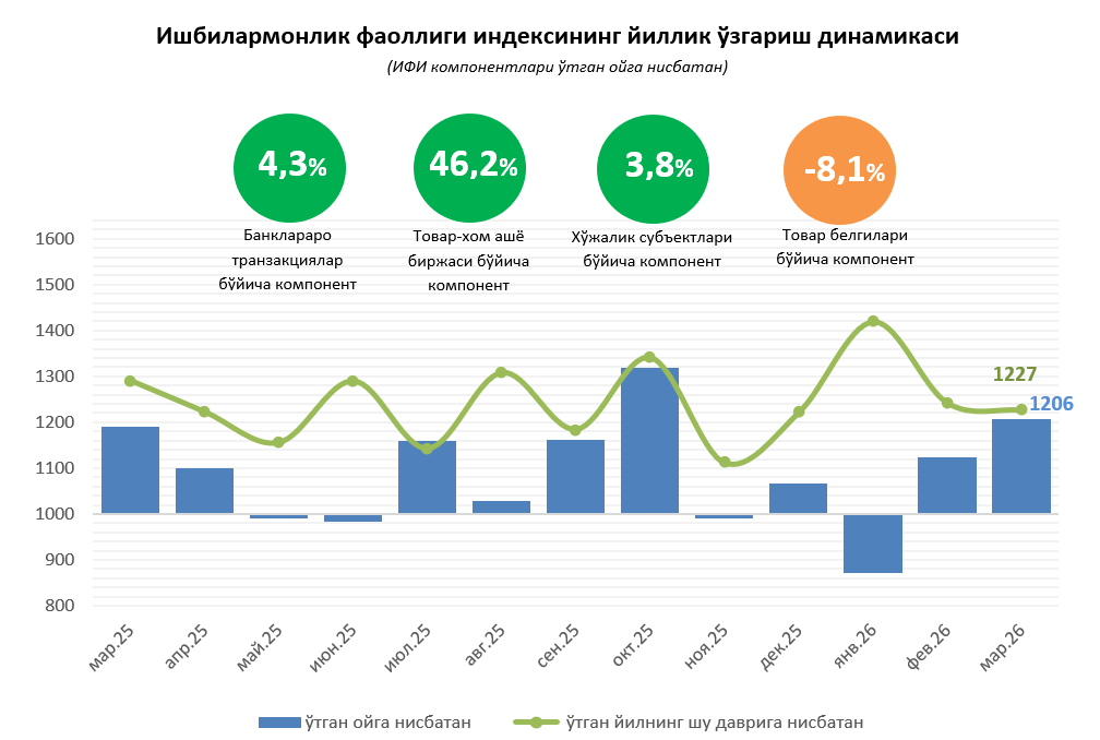 Иқтисодий тадқиқотлар ва ислоҳотлар маркази томонидан баҳоланган Ишбилармонлик фаоллиги индекси (ИФИ) 2026 йил март ойида 1206 бирликни ташкил этиб, ўтган ойга нисбатан 20,6 фоизга ошди. Шунингдек, ўтган йилнинг мос даврига нисбатан 22,7 фоизлик ўсиш қайд этилди.
