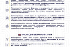 Кенгайтирилган GSP тизими Ўзбекистонга умумий қиймати 437 миллиард фунт стерлингдан ортиқ дунёнинг бешинчи энг йирик иқтисодиёти ва дунёнинг етакчи халқаро истеъмол ва чакана савдо бозорига кириш имконини беради. Буюк Британия учун эса минтақавий марказ бўлиб хизмат қиладиган ва минтақанинг энг жадал ўсаётган ва ривожланаётган бозорига киришни осонлаштиради ҳамда Ўзбекистоннинг ноёб тўқимачилик, қишлоқ хўжалиги маҳсулотлари ва бошқа турли хил маҳсулотларига йўл очади.