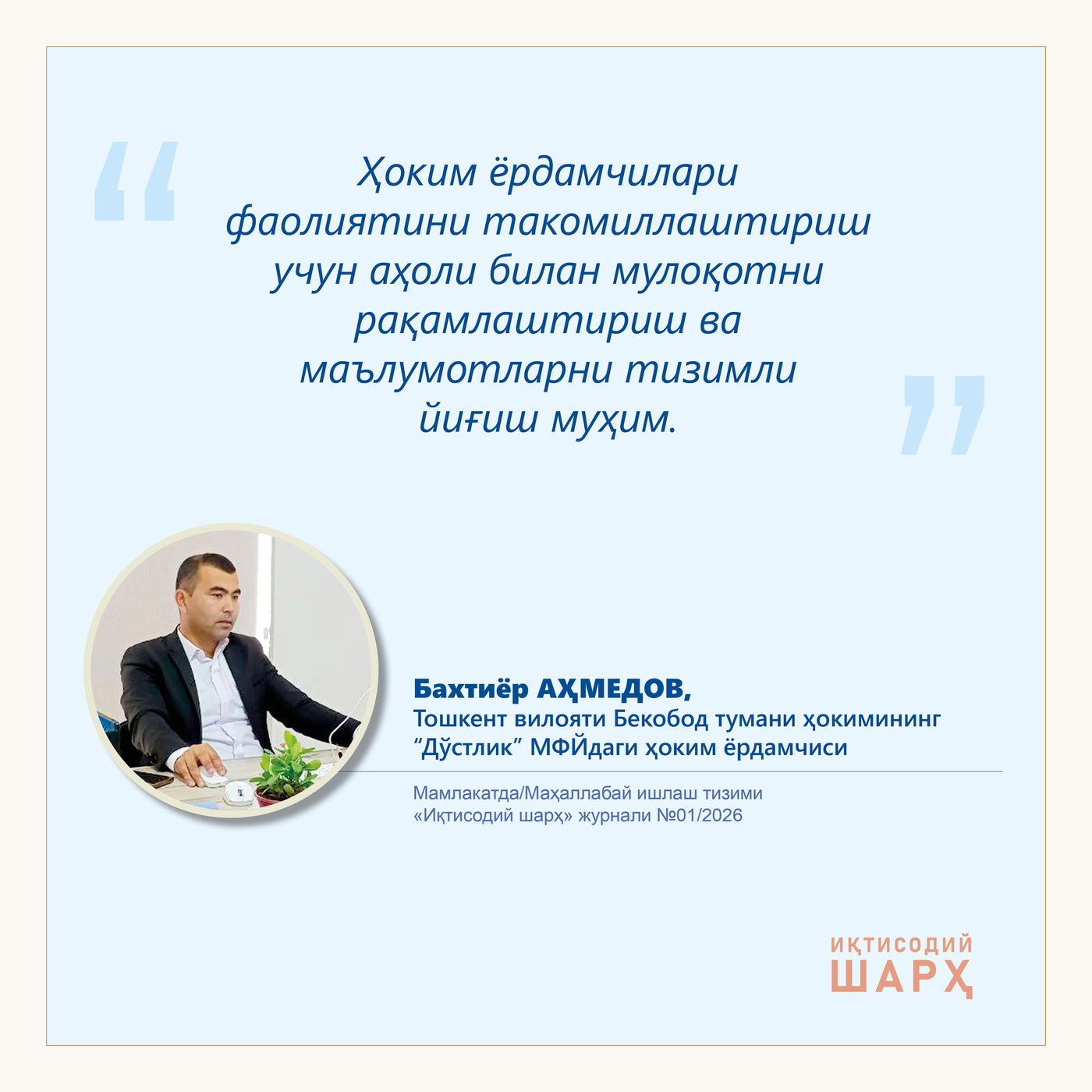 – Бу тизимдаги тажриба менга аҳоли муаммоларини аниқ тушуниш, тизимли қарорлар қабул қилиш ва тадбиркорликни ривожлантиришда амалий кўникмаларни олиш имконини берди.